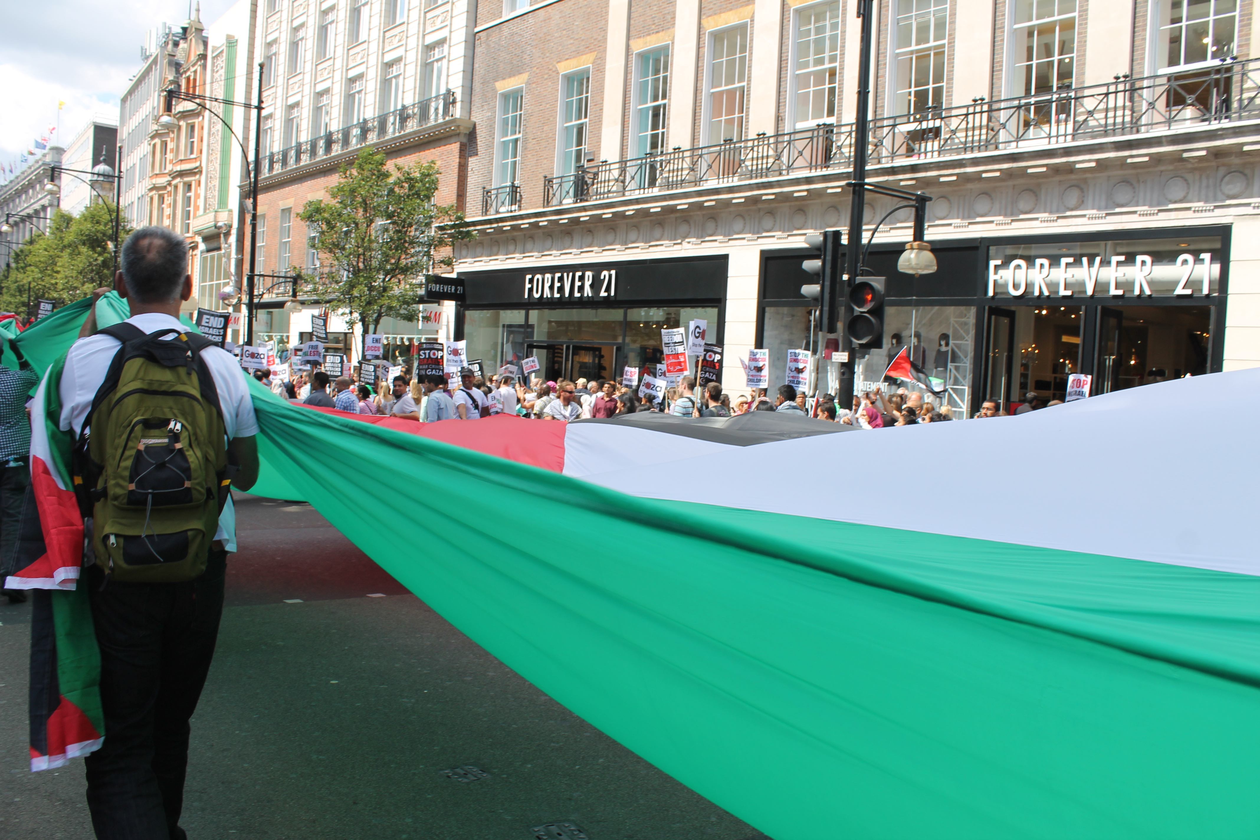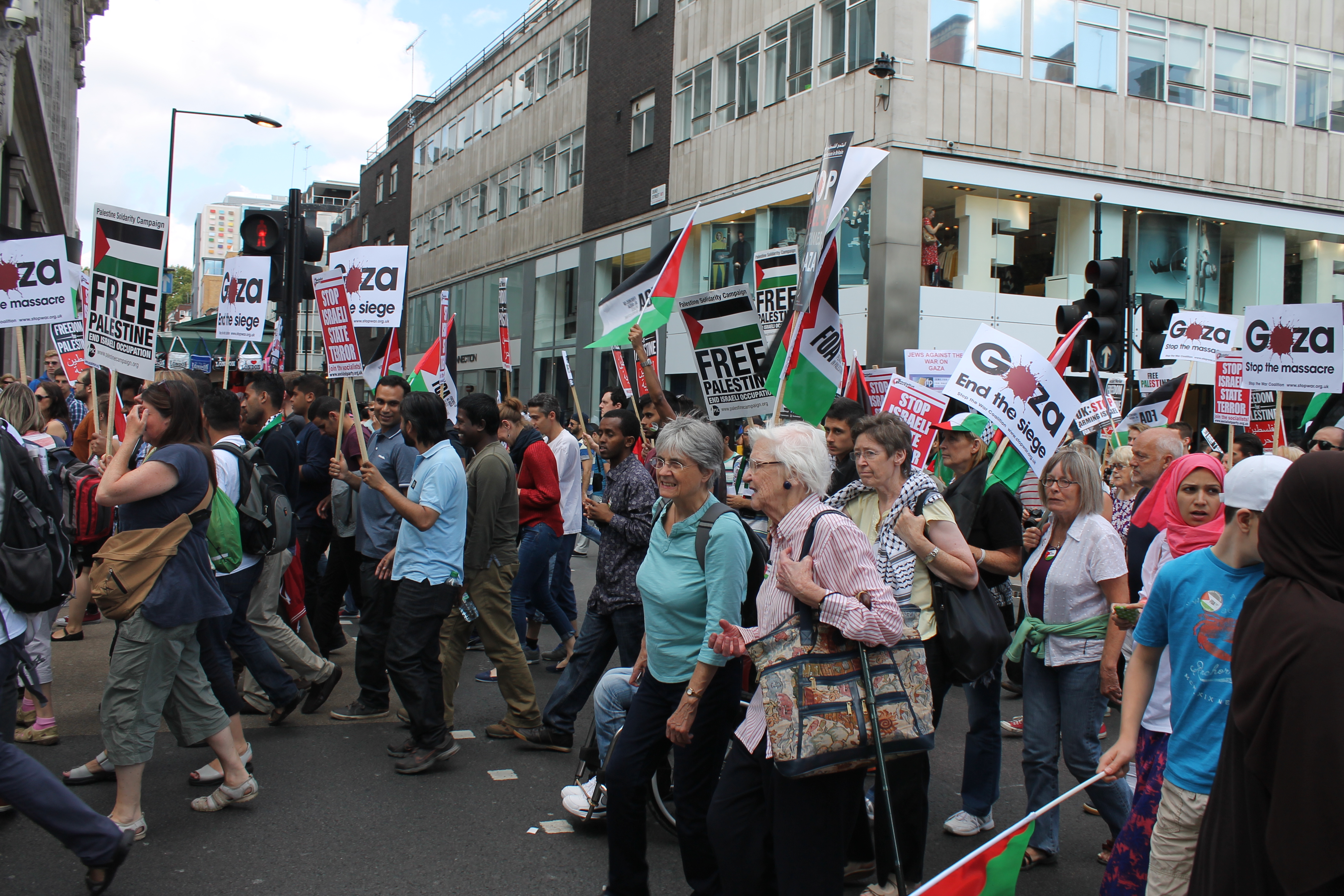 On Saturday August 9 2014, around 150,000 people (according to unofficial reports) took to the streets of London to call an end to conflict in Gaza. Starting outside the BBC’S HQ, in Portland Place, near the bustling shopping haven of Oxford Street, people of all ages and nationalities gathered to support an end to Israeli military action.
